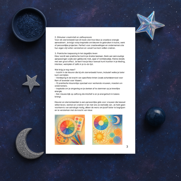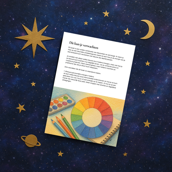Ontdek de magie van kleur met het ebook Kleuren en sterrenbeelden (A4, 40 pagina's). Leer welke kleuren jouw sterrenbeeld versterken, hoe je meer balans, energie en creativiteit in je leven brengt en hoe je kleur praktisch toepast in je kleding, interieur en dagelijkse routines.